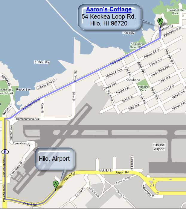 Exit Hilo Airport Terminal to the first traffic light you see. At the traffic light turn right (north) onto Highway 11 (Kanoelehua Avenue).